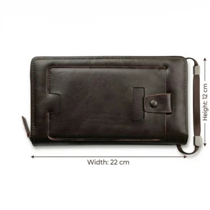 تأتي محفظة يد رجالي جلد اسود مع سحاب قوي وسوار يد مريح يسهل حملها أثناء التنقل أو التسوق، كما تحتوي على عدة جيوب مخصصة لحفظ النقود والبطاقات والعملات المعدنية بطريقة منظمة. يبلغ مقاس المحفظة حوالي 22 سم عرض × 12 سم طول، وهو حجم مثالي يوفر مساحة كافية لتنظيم الأغراض اليومية دون أن تكون كبيرة أو غير عملية.