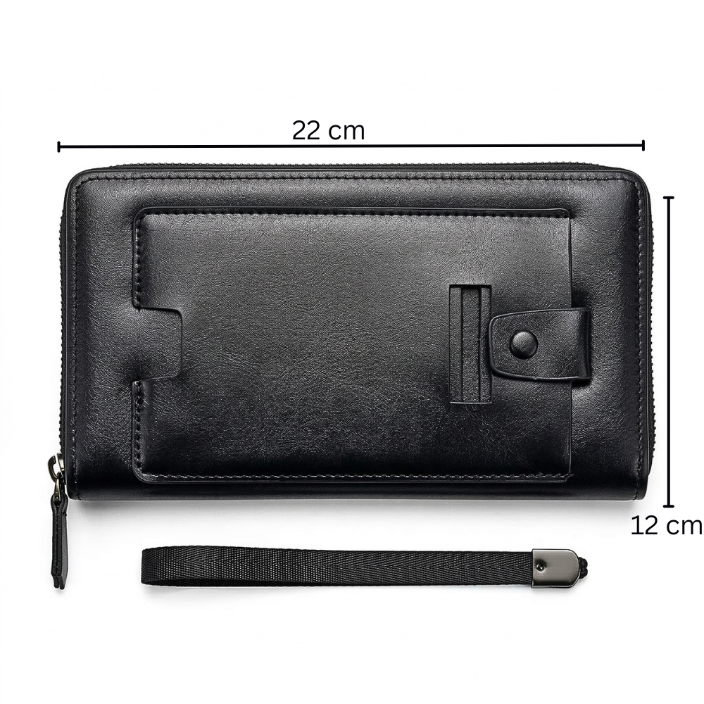تأتي محفظة يد رجالي جلد اسود مع سحاب قوي وسوار يد مريح يسهل حملها أثناء التنقل أو التسوق، كما تحتوي على عدة جيوب مخصصة لحفظ النقود والبطاقات والعملات المعدنية بطريقة منظمة. يبلغ مقاس المحفظة حوالي 22 سم عرض × 12 سم طول، وهو حجم مثالي يوفر مساحة كافية لتنظيم الأغراض اليومية دون أن تكون كبيرة أو غير عملية.
