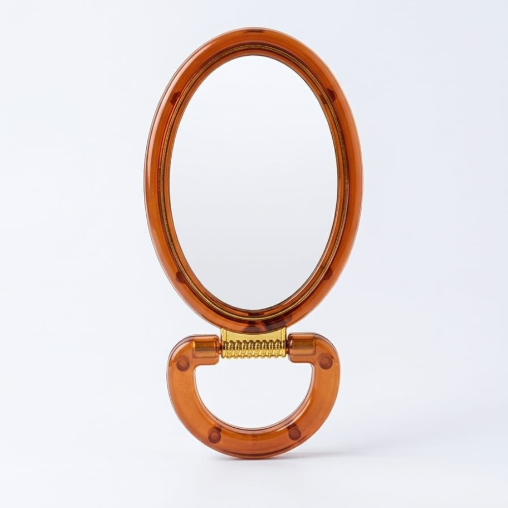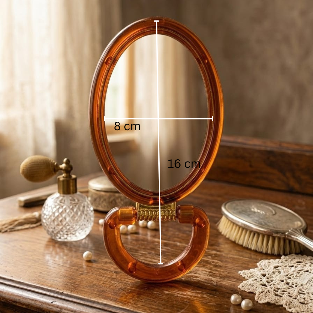 مراية عسلي بيضاوية 16×8 سم – مرآة يد أنيقة بتصميم كلاسيكي لون عسلي شفاف