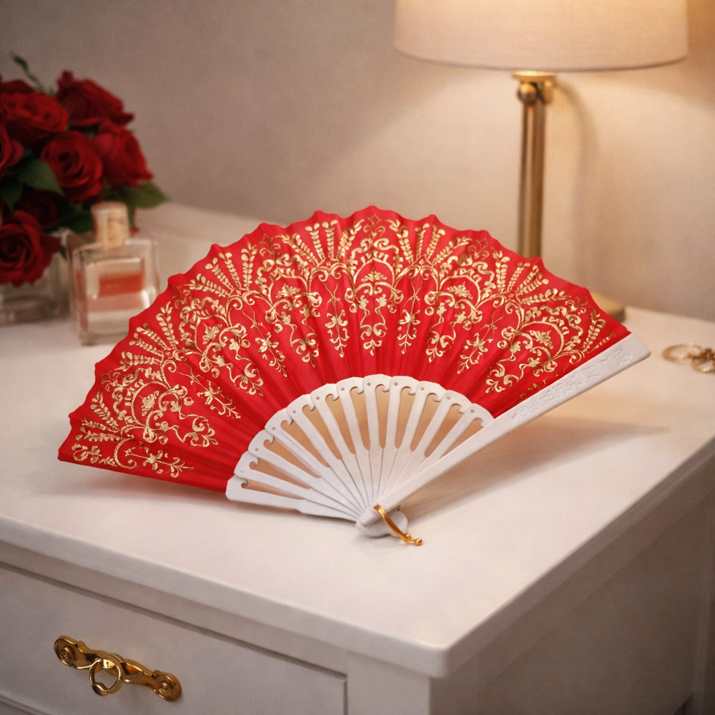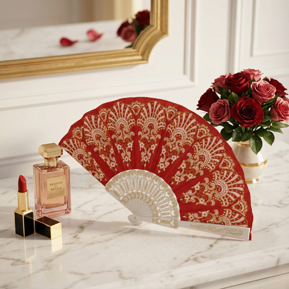 أصبحت مروحة يد قابلة للطي من القطع المستخدمة بكثرة في جلسات التصوير والديكور، خاصة مع الألوان الفخمة والتفاصيل المزخرفة.