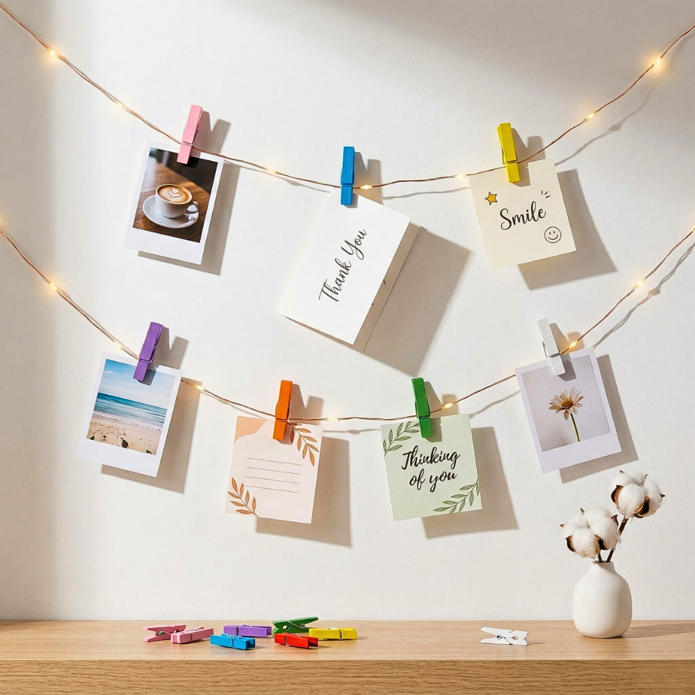 يمكن استخدامه لإنشاء ركن صور مميز داخل المنزل، سواء في غرفة النوم أو غرفة المعيشة. تعليق الصور على خيط مزين أو شريط بسيط يعطي إحساسًا بالدفء ويجعل المكان أكثر حيوية.