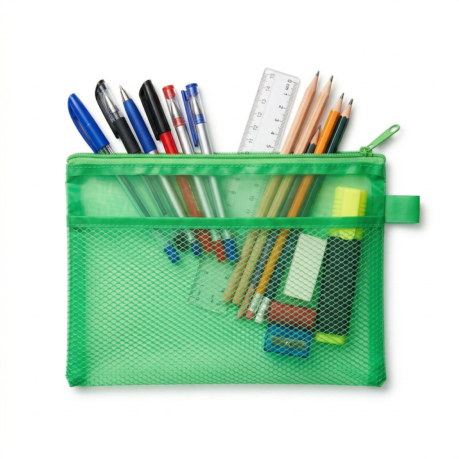 تساعد مقلمة شبك شفافة خضراء في ترتيب كل الأدوات في مكان واحد، مما يوفر الوقت عند البحث عن قلم أو ممحاة أو أي أداة أخرى.