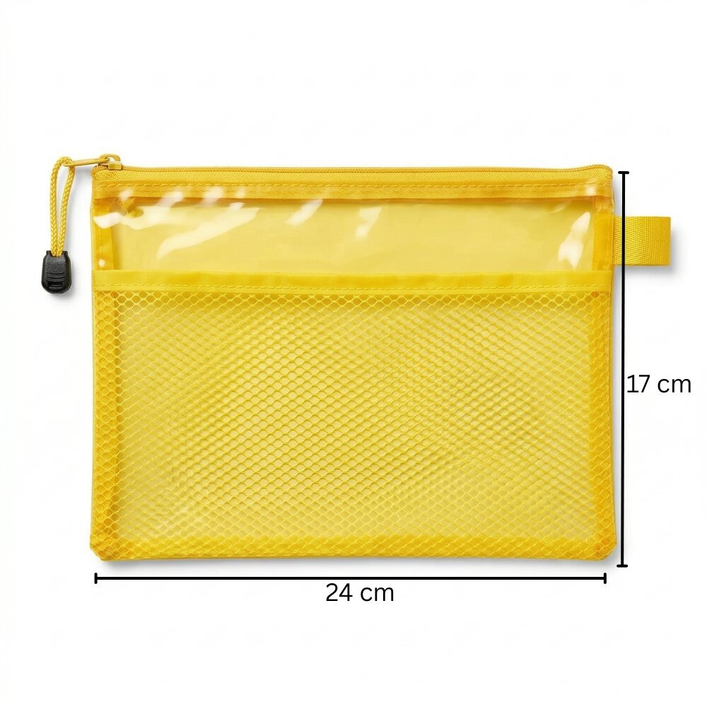 تأتي مقلمة شبك شفافة صفراء بمقاس مثالي 24 × 17 سم، وهو حجم مناسب لحفظ عدد كبير من الأدوات الأساسية.