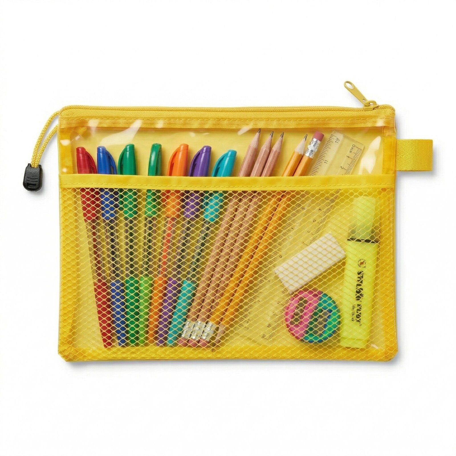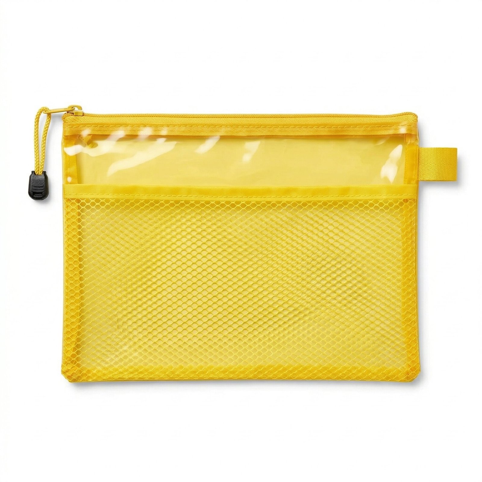 تم تزويد مقلمة شبك شفافة صفراء بسحاب قوي وسهل الاستخدام يتحمل الفتح والإغلاق المتكرر.