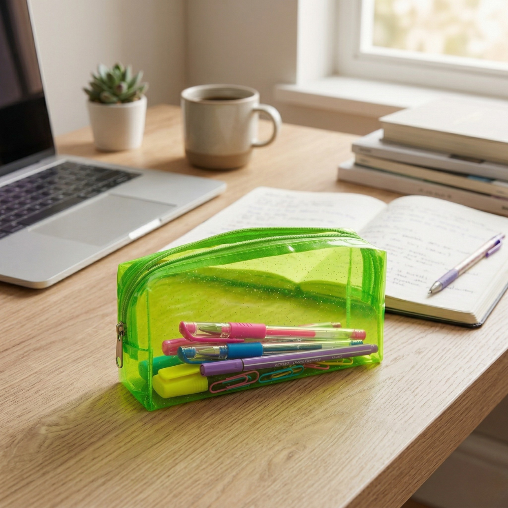 سواء كنت تبدأ يومك الدراسي أو العملي، فإن الاعتماد على مقلمة شفافة أخضر يساعدك على تجهيز أدواتك بسرعة دون إضاعة وقت.