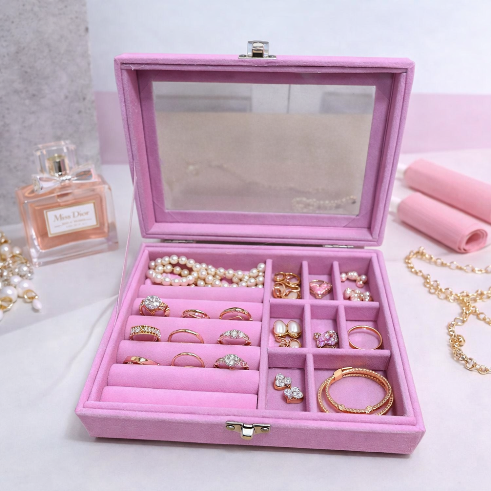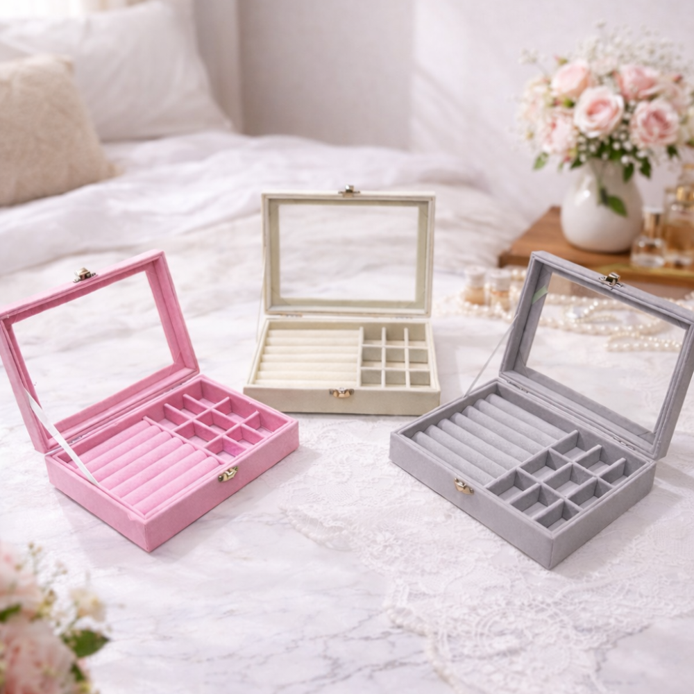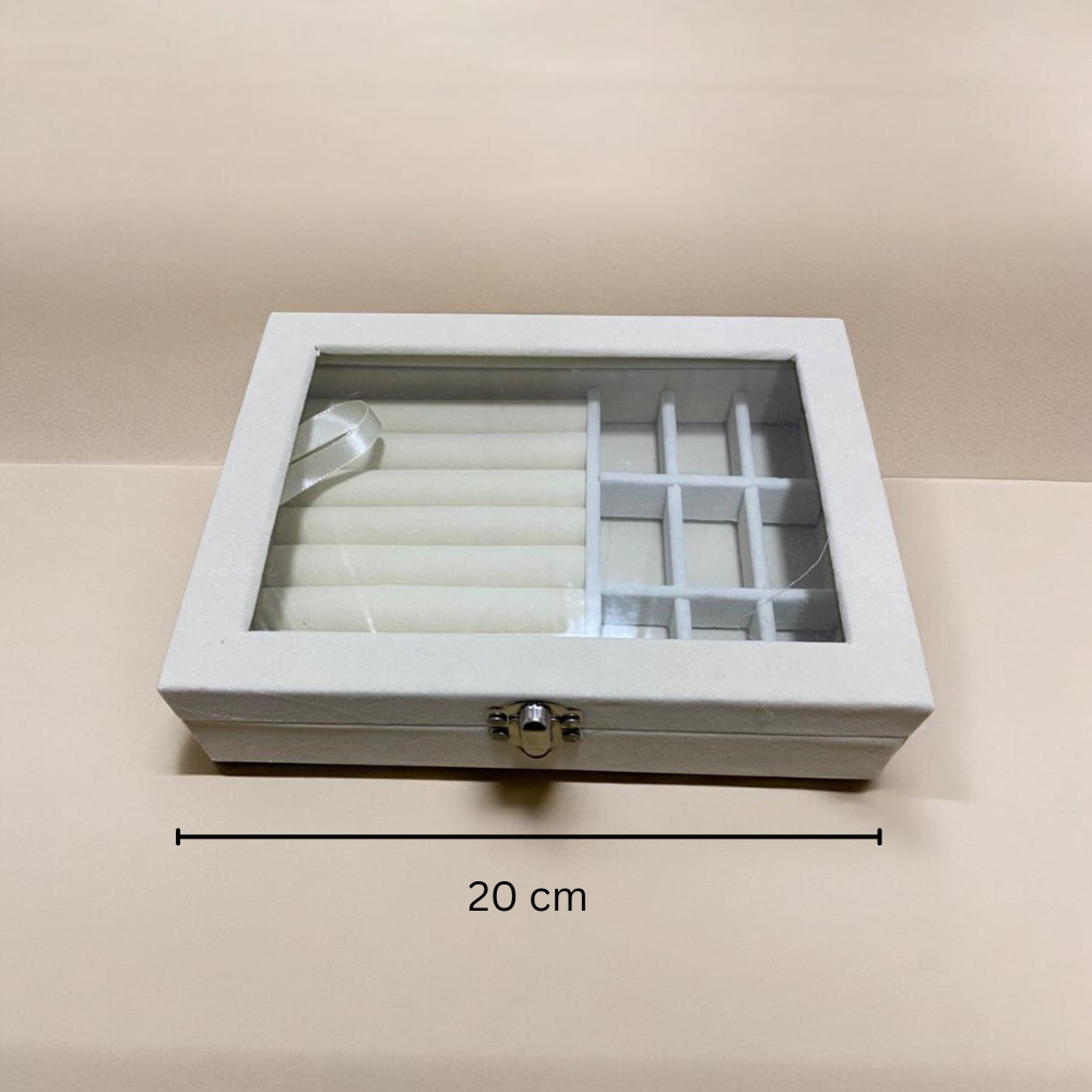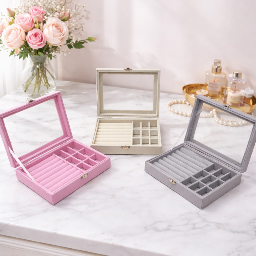 إذا كنتِ تبحثين عن طريقة أنيقة وعملية لترتيب مجوهراتك اليومية، فإن منظم اكسسوار المخملي بغطاء زجاجي هو الحل المثالي للحفاظ على الإكسسوارات في مكان واحد بشكل منظم وآمن. يتميز التصميم بسطح شفاف يسمح برؤية المحتويات بسهولة دون الحاجة لفتح الصندوق، مع تقسيمات داخلية متعددة مخصصة للخواتم والأقراط والسلاسل.