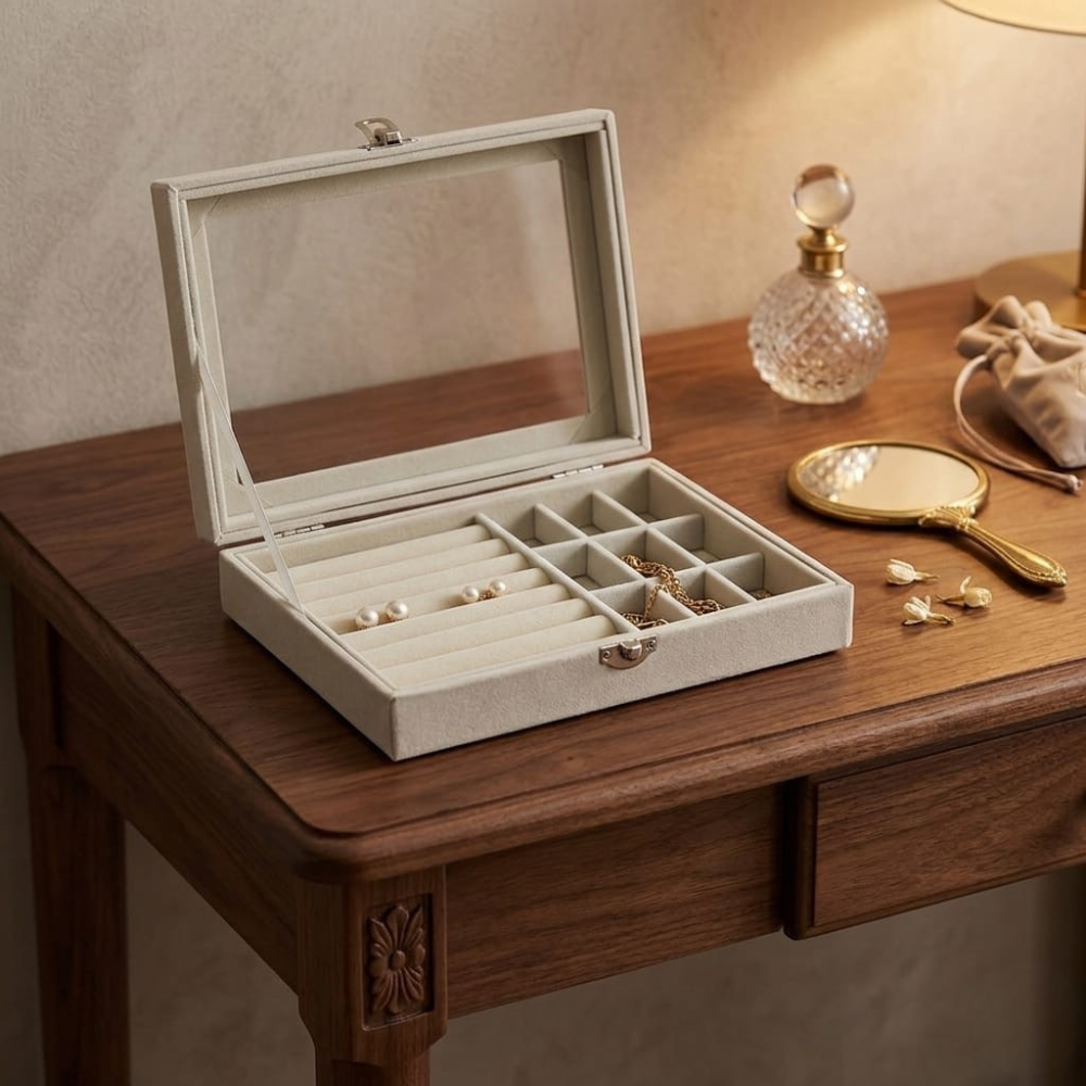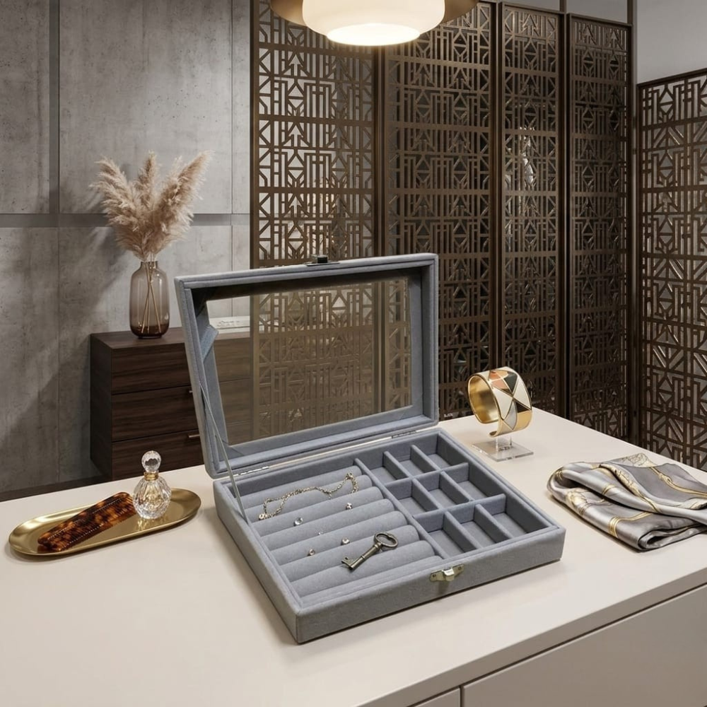 الغطاء الزجاجي يسمح برؤية جميع القطع فورًا، كما أن ترتيب الخانات يجعل كل قطعة في مكانها المحدد. وهذا يعني أنك لن تحتاجي إلى البحث داخل الأدراج أو الصناديق المختلفة كل صباح.