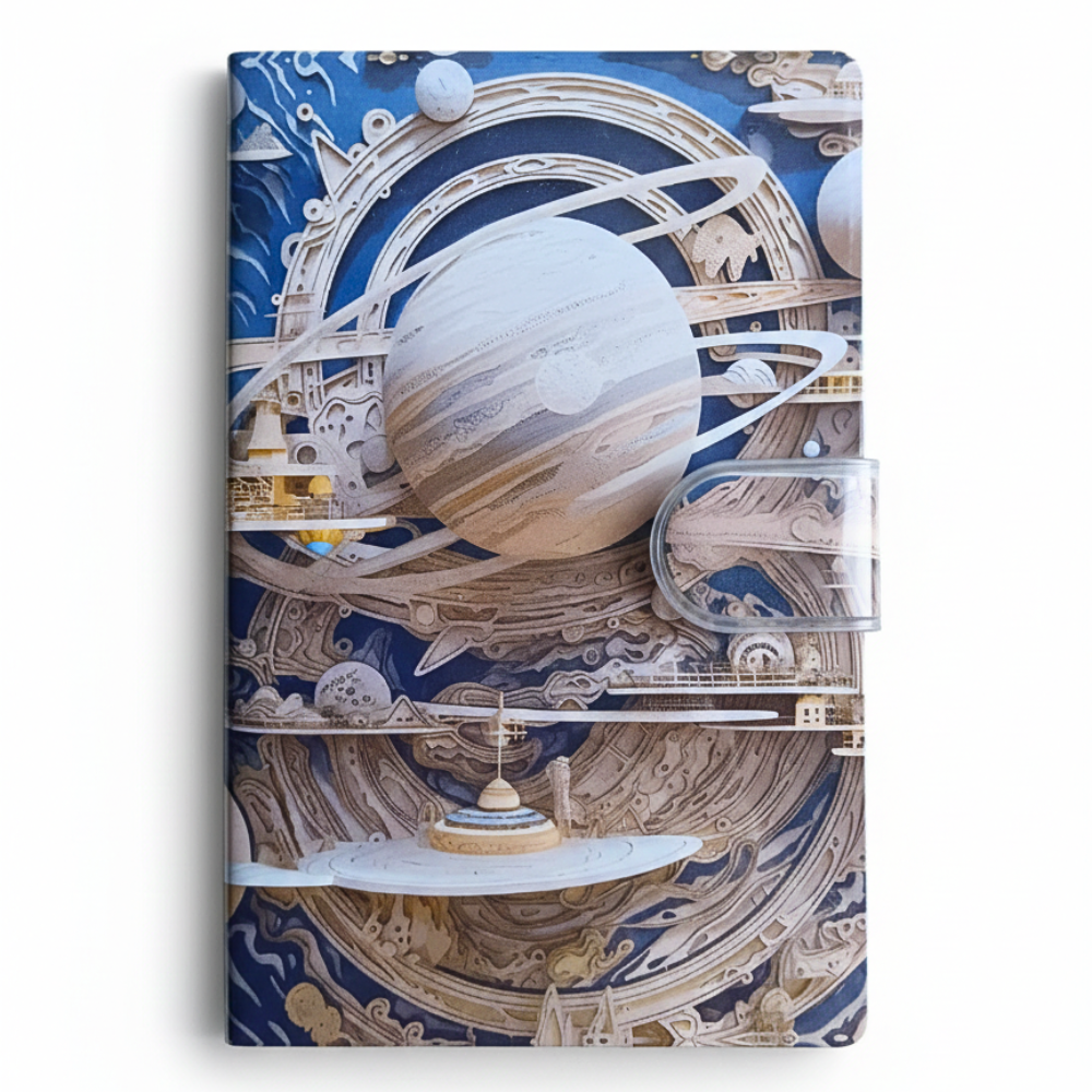 نوتة جيب صغيرة برسمة كواكب وفضاء ثلاثي الأبعاد – 14.5×6.5 سم بحزام إغلاق