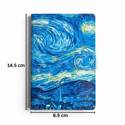اللي بيميز النوتة دي مش بس حجمها العملي، لكن كمان تصميمها الفني المميز المستوحى من لوحة عالمية بألوان زرقاء متداخلة تعكس الهدوء والإبداع. التصميم ده بيخلي النوتة مش مجرد أداة كتابة، لكن قطعة فنية صغيرة معاك طول الوقت.