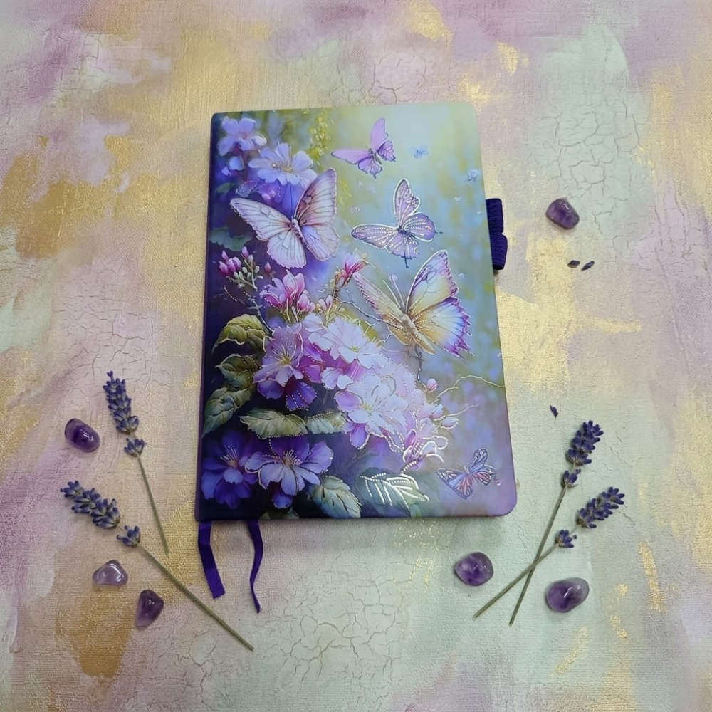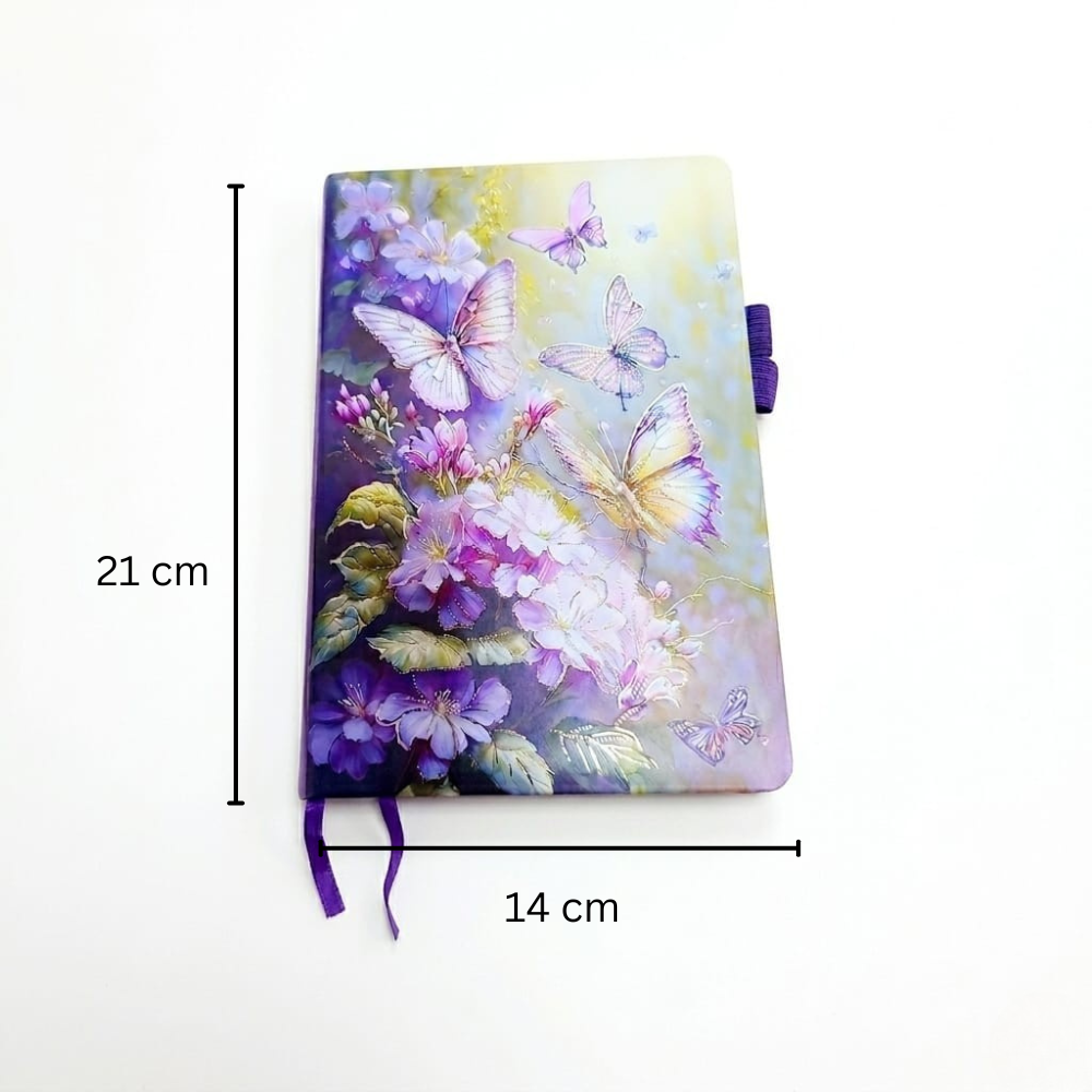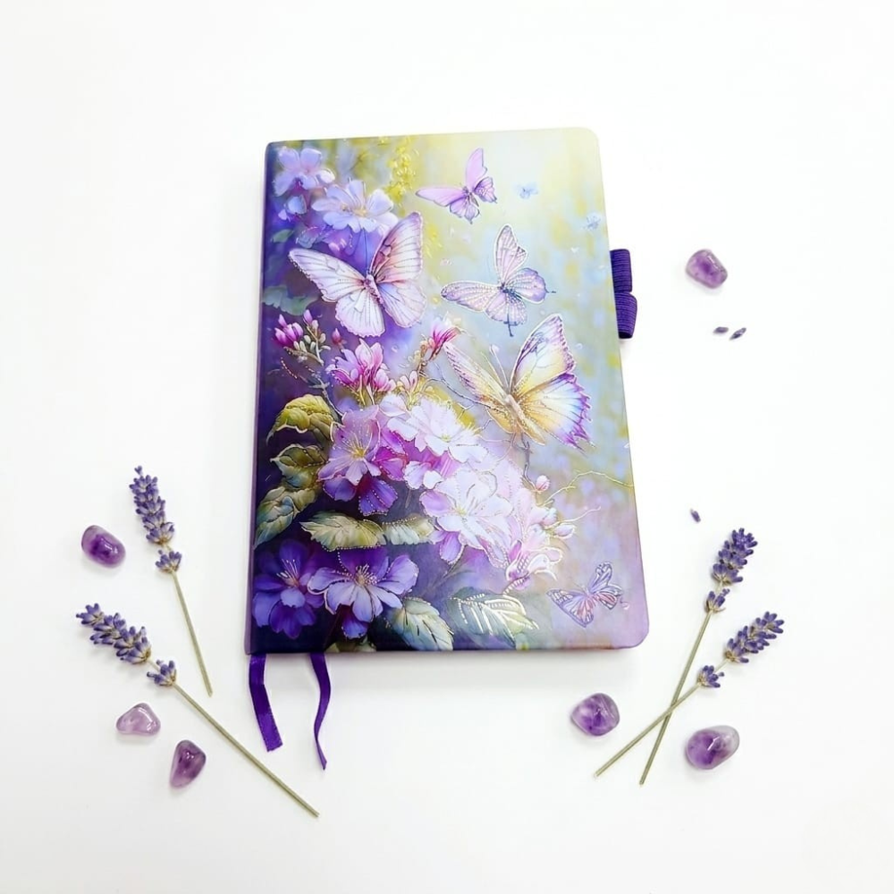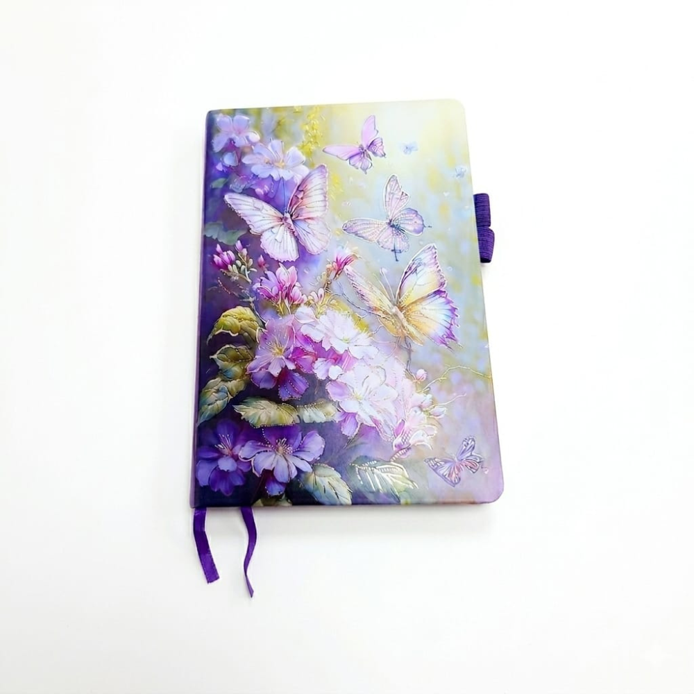 الاهتمام بالتفاصيل في تصميم النوت واضح جدًا، من اختيار الألوان المتدرجة بين البنفسجي والأصفر الهادئ، لحد توزيع الفراشات والزهور بشكل فني يخلي كل جزء في الغلاف له جاذبيته الخاصة. وده بيدي إحساس بالهدوء والراحة، وده مهم جدًا لأي حد بيستخدم النوت لفترات طويلة سواء في المذاكرة أو الشغل.