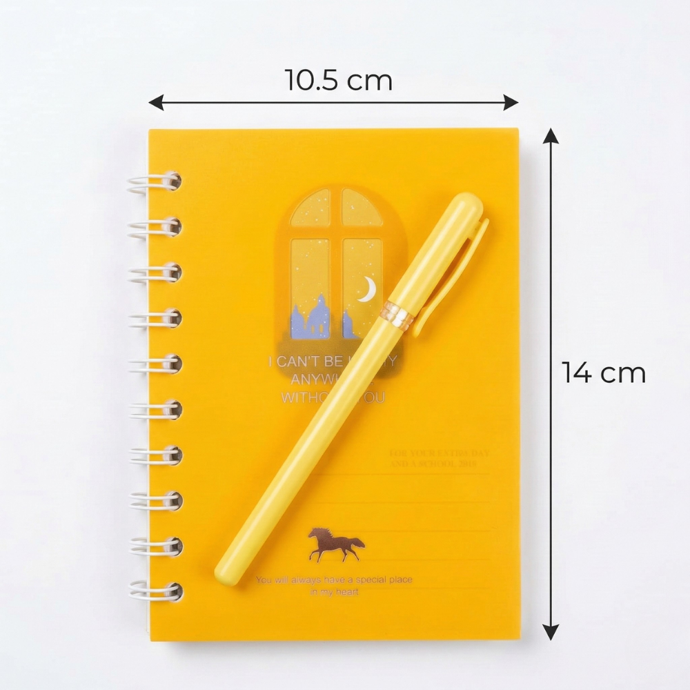 تم تصميم نوت بوك سلك مع قلم بمقاس عملي يبلغ 14 سم طول × 10.5 سم عرض، وهو حجم مثالي يسمح بحمل المفكرة بسهولة في الحقيبة أو حتى في اليد. هذا الحجم يجعل نوت بوك سلك مع قلم مناسبة للاستخدام في أي مكان سواء في المدرسة أو المكتب أو أثناء التنقل.
