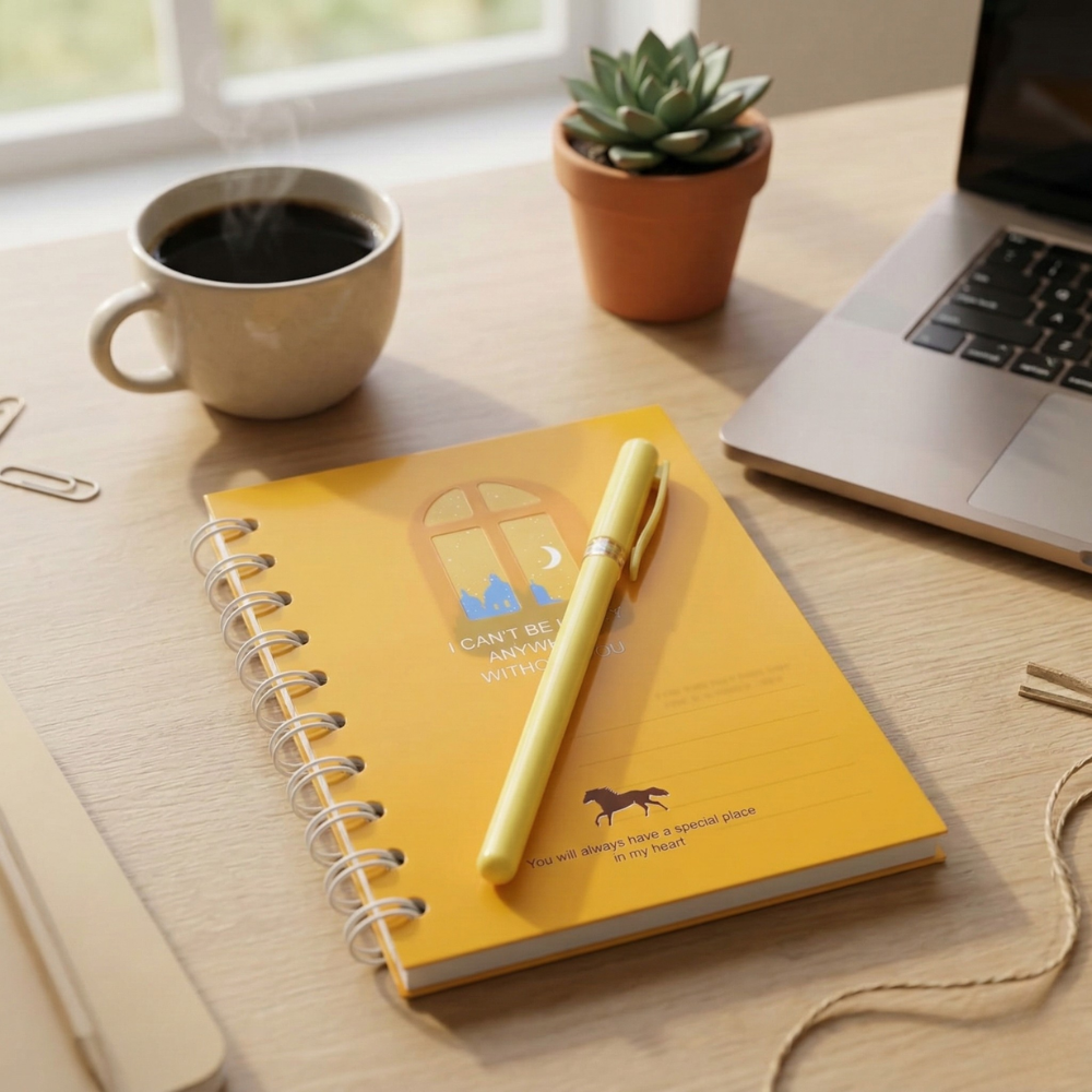 عندما يكون المكتب مرتبًا ويحتوي على أدوات بسيطة وجميلة، يصبح العمل أكثر متعة وتركيزًا. كما أن وجود مفكرة على المكتب يجعل من السهل تدوين أي ملاحظة أو فكرة دون الحاجة إلى البحث عن ورقة أو استخدام الهاتف.