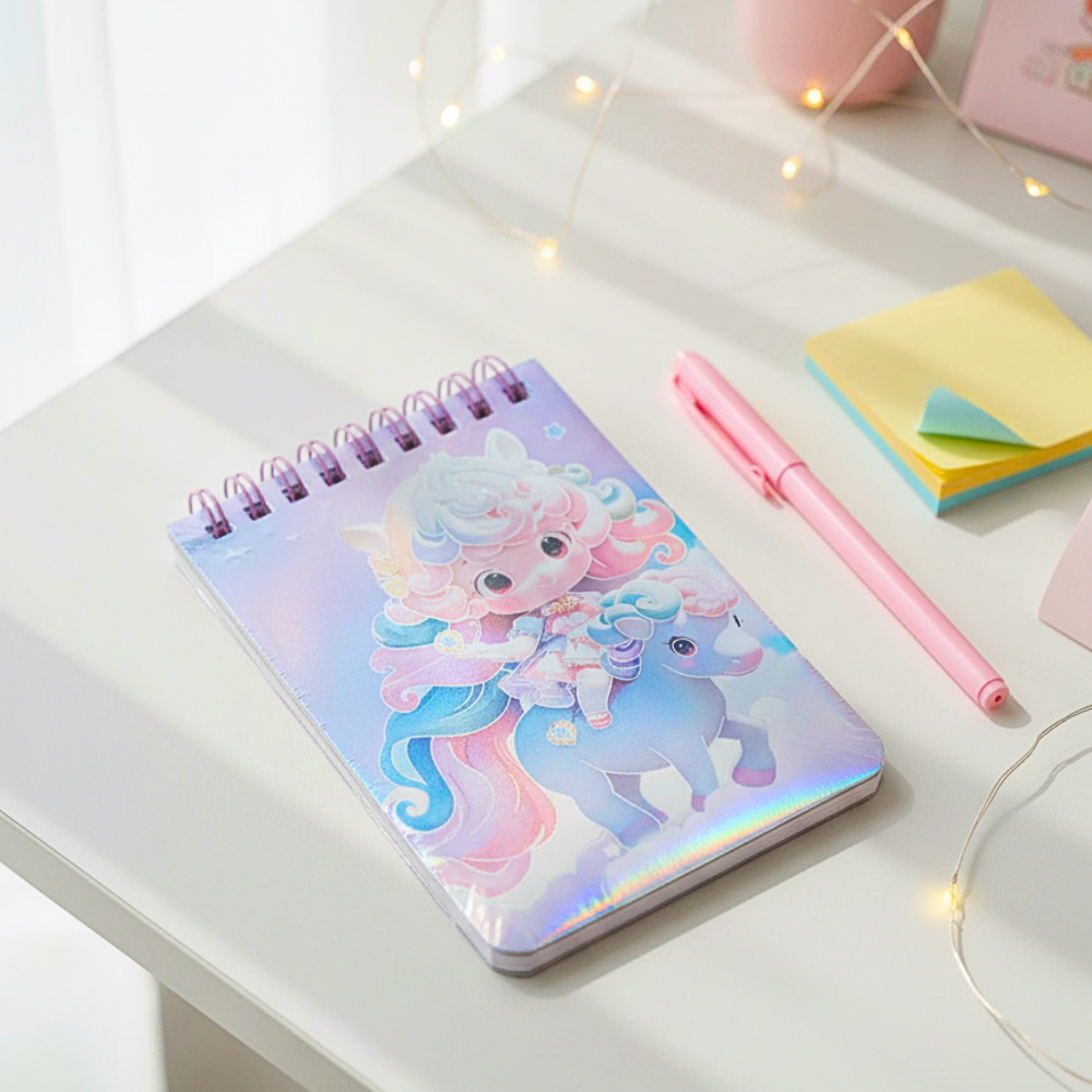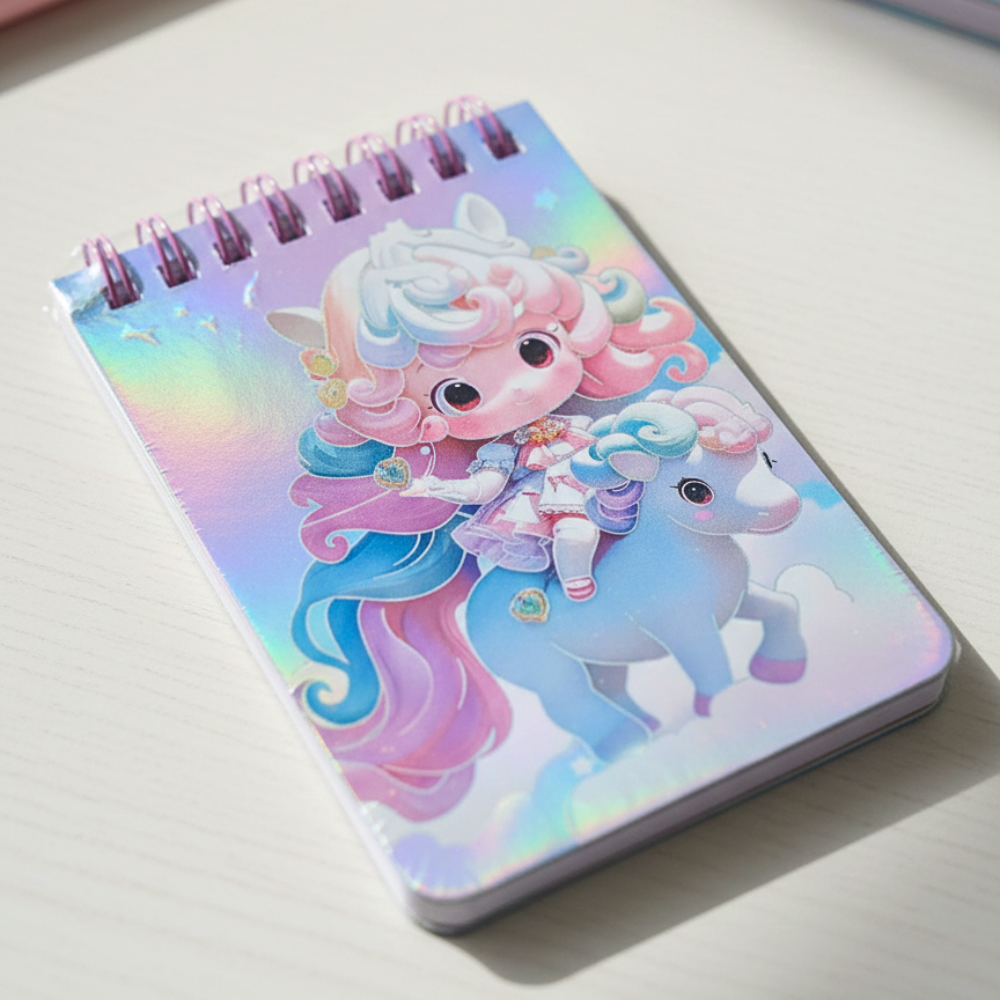 نوت بوك سلك صغيرة هولوجرام بتصميم يونيكورن كيوت وألوان باستيل لامعة تضيف لمسة جذابة ومميزة لشنطتك أو مكتبك. تأتي نوت بوك بمقاس عملي 11×7.5 سم، سهلة الحمل والاستخدام لتدوين الملاحظات اليومية والأفكار السريعة، مع غلاف لامع هولوجرام يعكس الإضاءة بشكل رائع ويجعلها اختيار مثالي للأطفال والطلاب ومحبي التصاميم اللطيفة. ✨💜