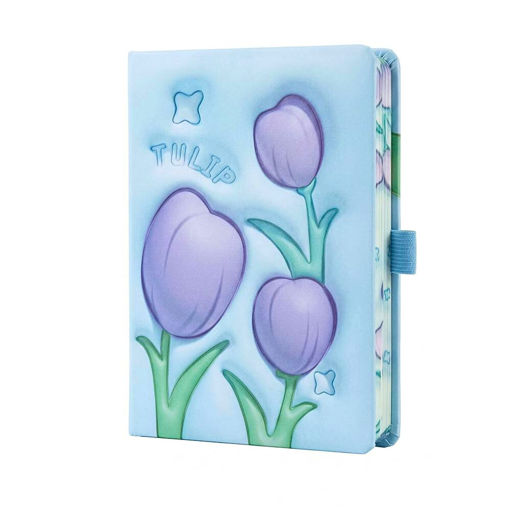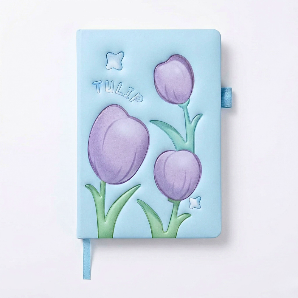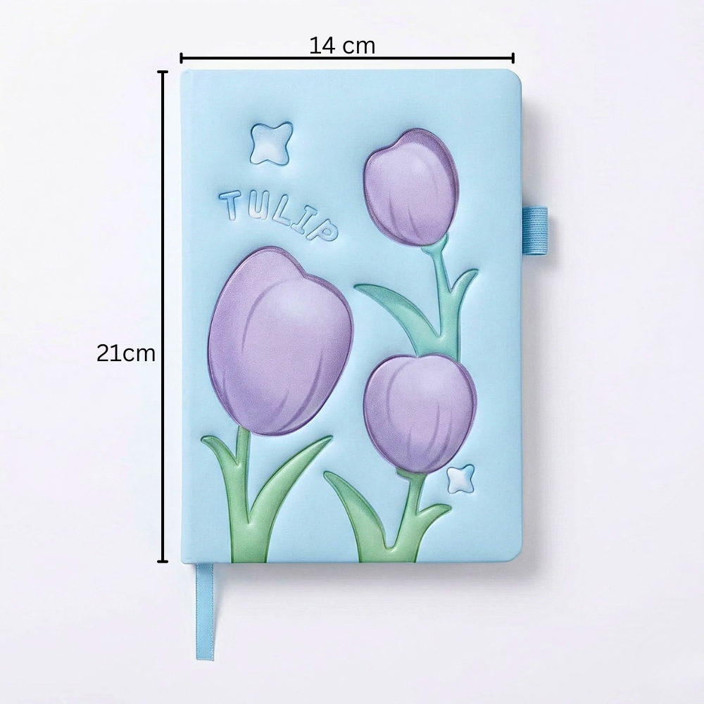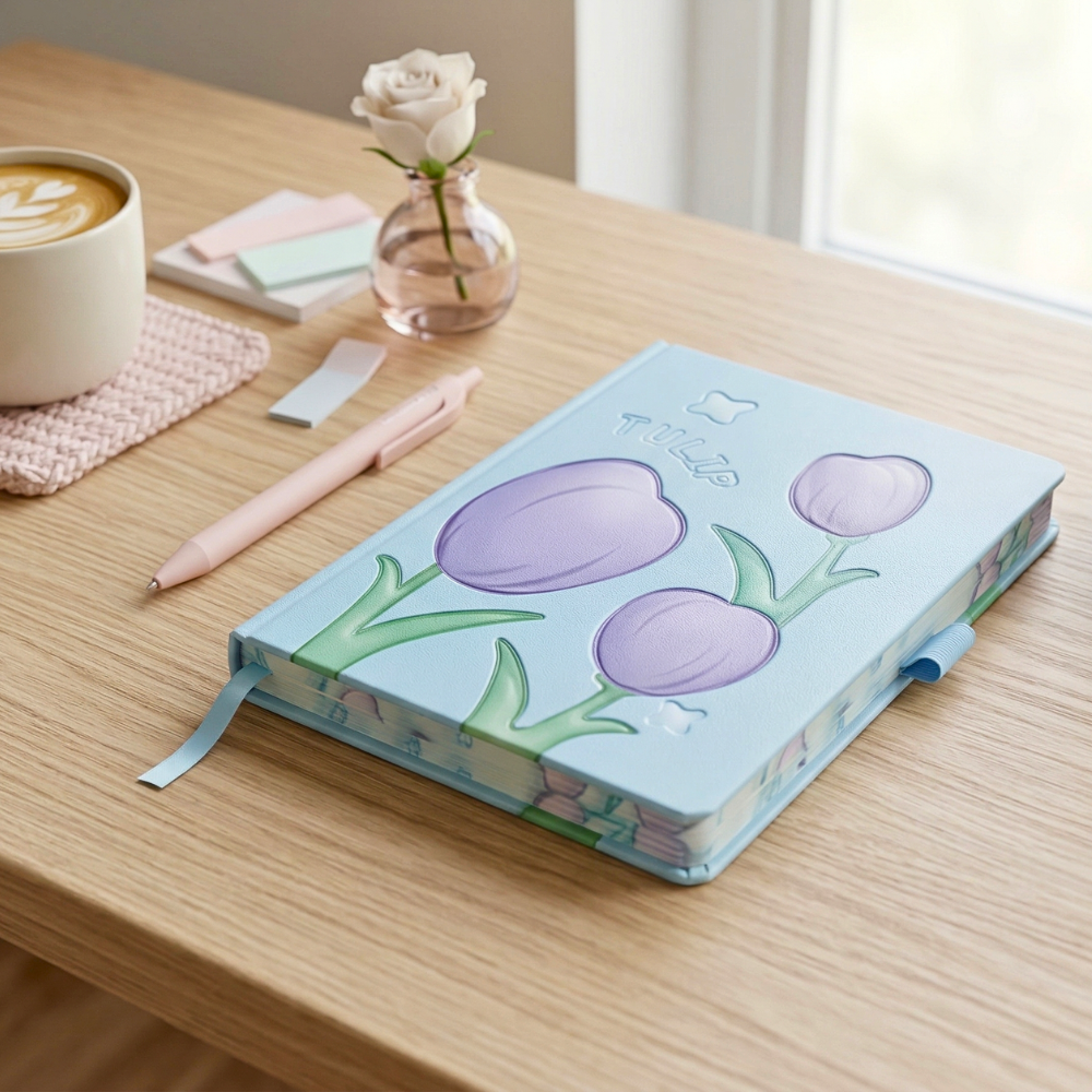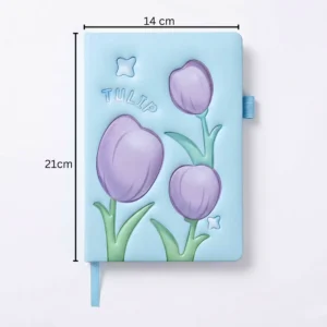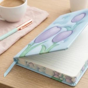التصميم المستوحى من زهور التوليب بيخلي نوت بوك هارد كوفر قطعة مميزة مش مجرد دفتر. الألوان الهادية زي الأزرق والبنفسجي بتدي إحساس بالهدوء والتركيز، وده مهم جدًا أثناء الدراسة أو الشغل.
